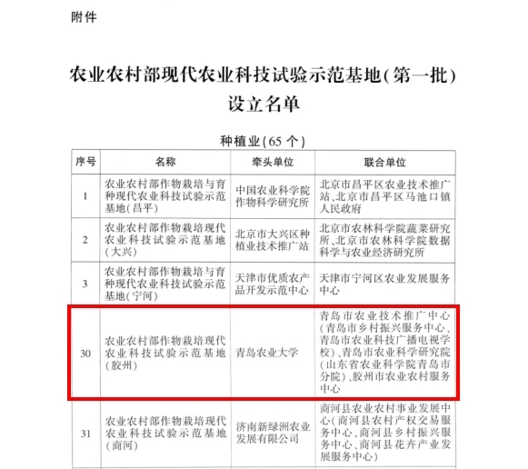 近日,农业农村部印发《农业农村部办公厅关于设立农业农村部现代农业科技试验示范基地(第一批)的通知》(农办科〔2025〕16号),由青岛农业大学现代农业科技服务中心牵头申报的“农业农村部作物栽培现代农业科技试验示范基地(胶州)”成功入选。